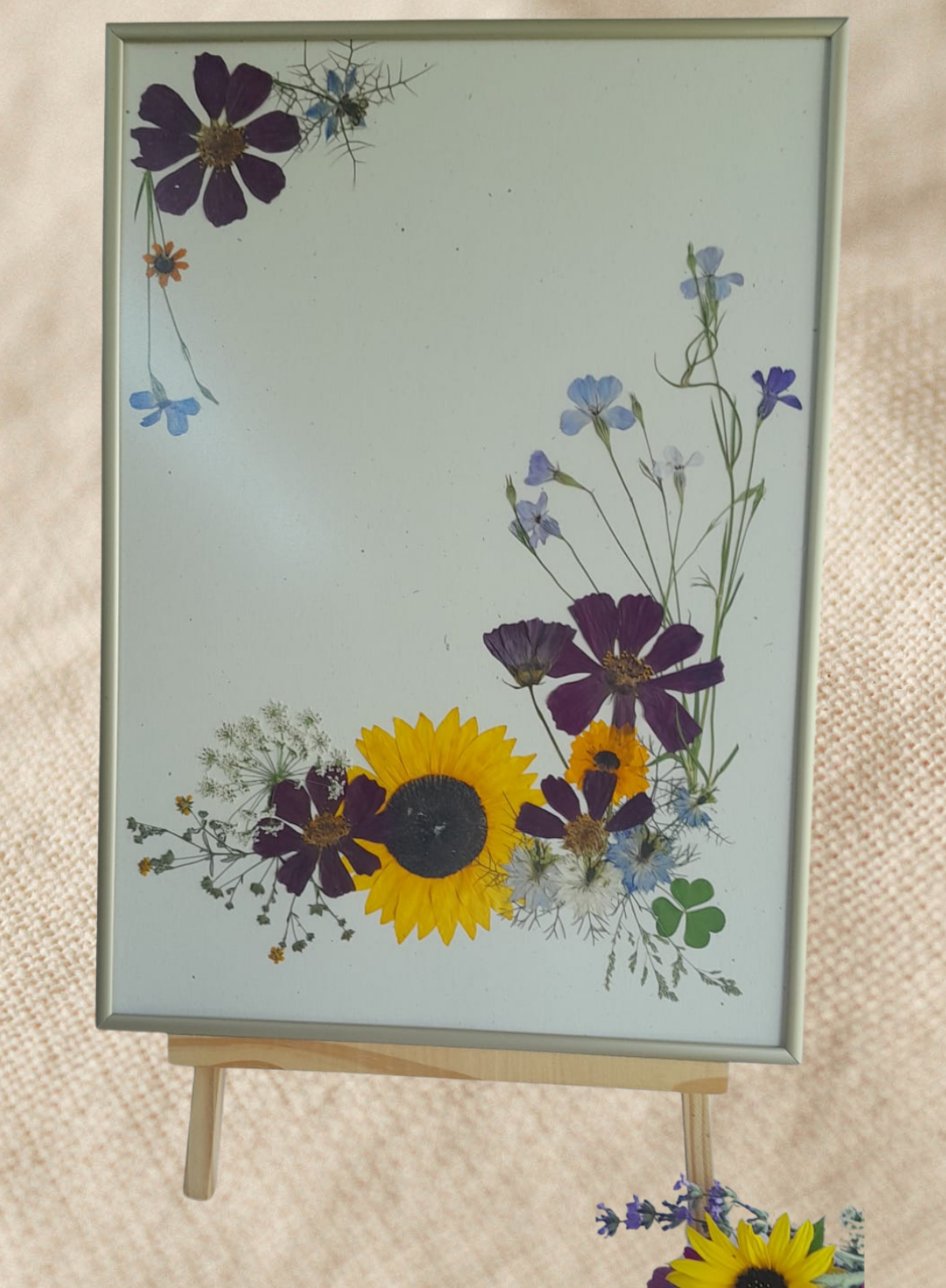 Descoperă un tablou realizat cu flori presate autentice, culese din grădina de vară. Floarea soarelui, nigella, agrostemma îmbinate armonios, aerisit, într-o compoziţie care inspiră echilibru şi naturaleţe.
