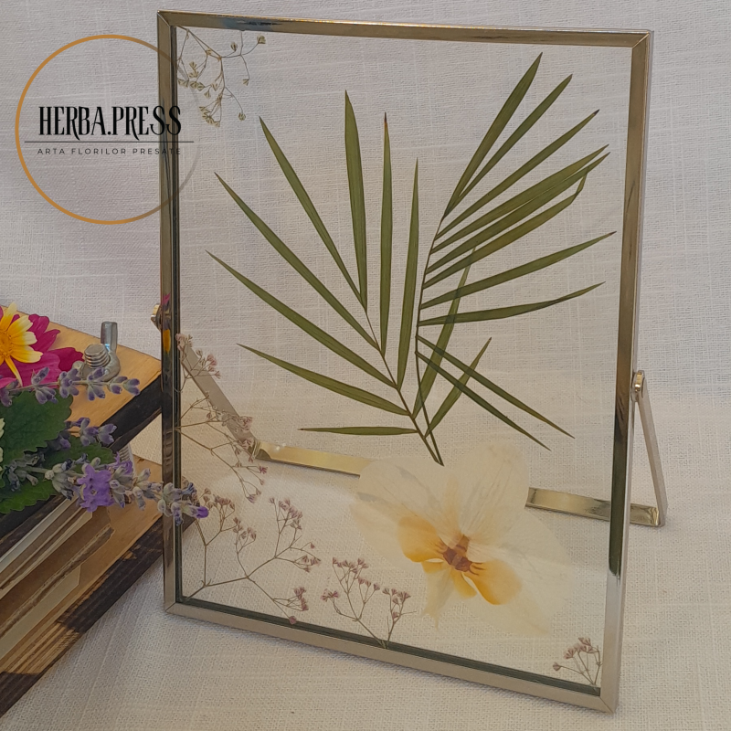 Din colecţia Decor Urban - un tablou realizat cu flori presate autentice- orhidee şi elemente botanice tip urban jungle, pentru un efect modern şi relaxant. Orhideea este o plantă versatilă, care nu domină vizual, ci vine în completarea esteticii urban jungle.